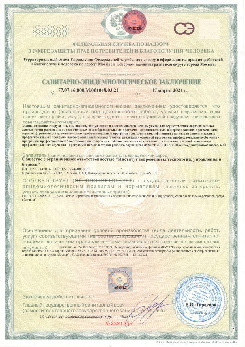 - Санитарно — Эпидемиологическое заключение ООО «Институт современных технологий, управления и бизнеса»